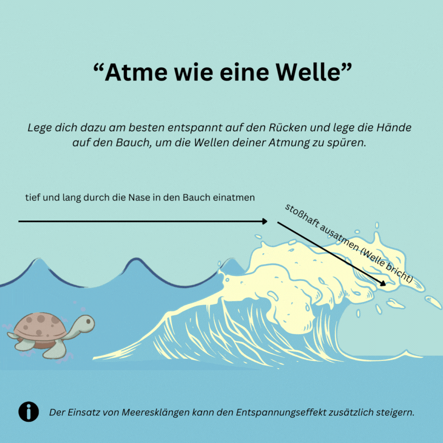 Die Wellenatmung eignet sich hervorragend zur Beruhigung und Entspannung. Sie kann toll mit Traumreisen/Meditationen rund um das Thema Meer und mit auditiven Effekten, wie z.B. Meeresrauschen, kombiniert werden.